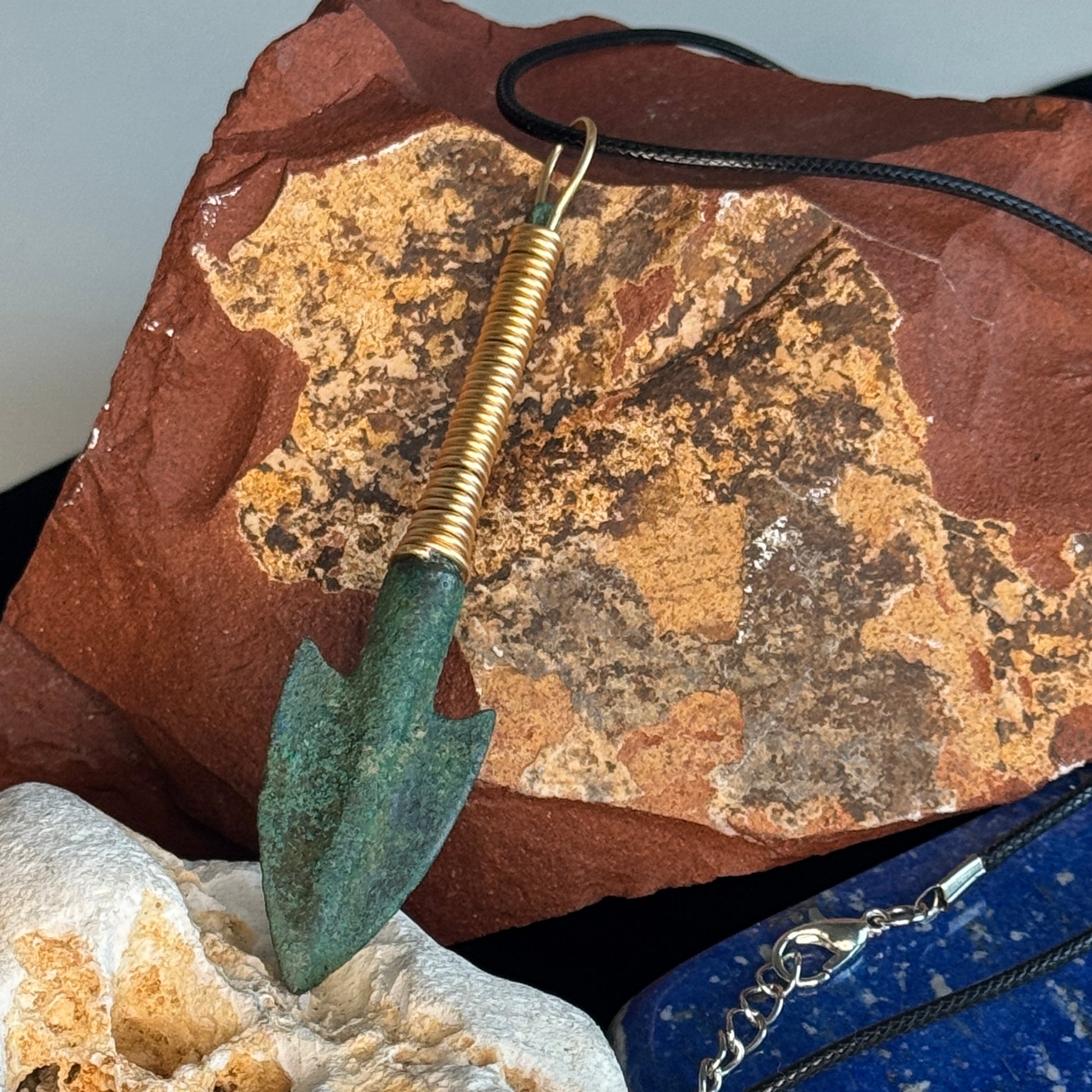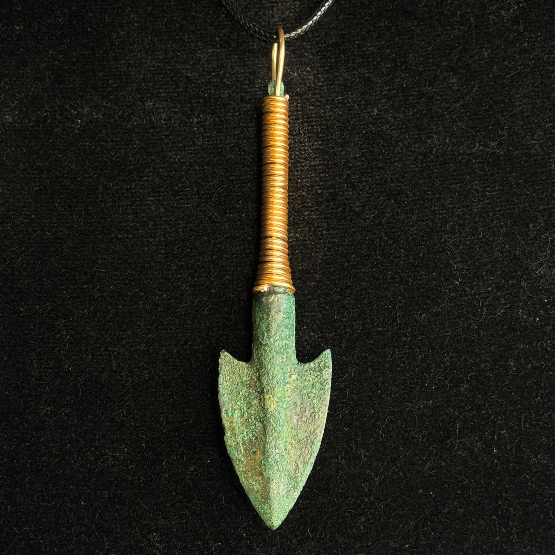 Once a projectile of war, this artefact has been beautifully transformed into a wearable link to the ancient past. The arrowhead, adorned with a natural green patina formed over millennia, is elegantly mounted in hand-wound bronze wire, uniting timeless history with modern artistry.