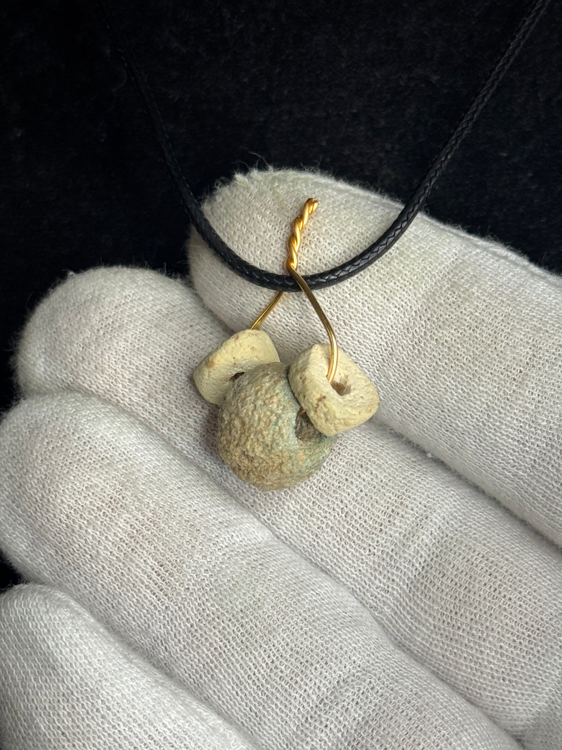 The beads, each meticulously handcrafted over 2,000 years ago, are strung together to create a beautiful piece that harmonizes antiquity with modern design. The beads exhibit the characteristic turquoise and earthy tones, representing life, rebirth, and protection, themes often associated with faience in Egyptian culture.