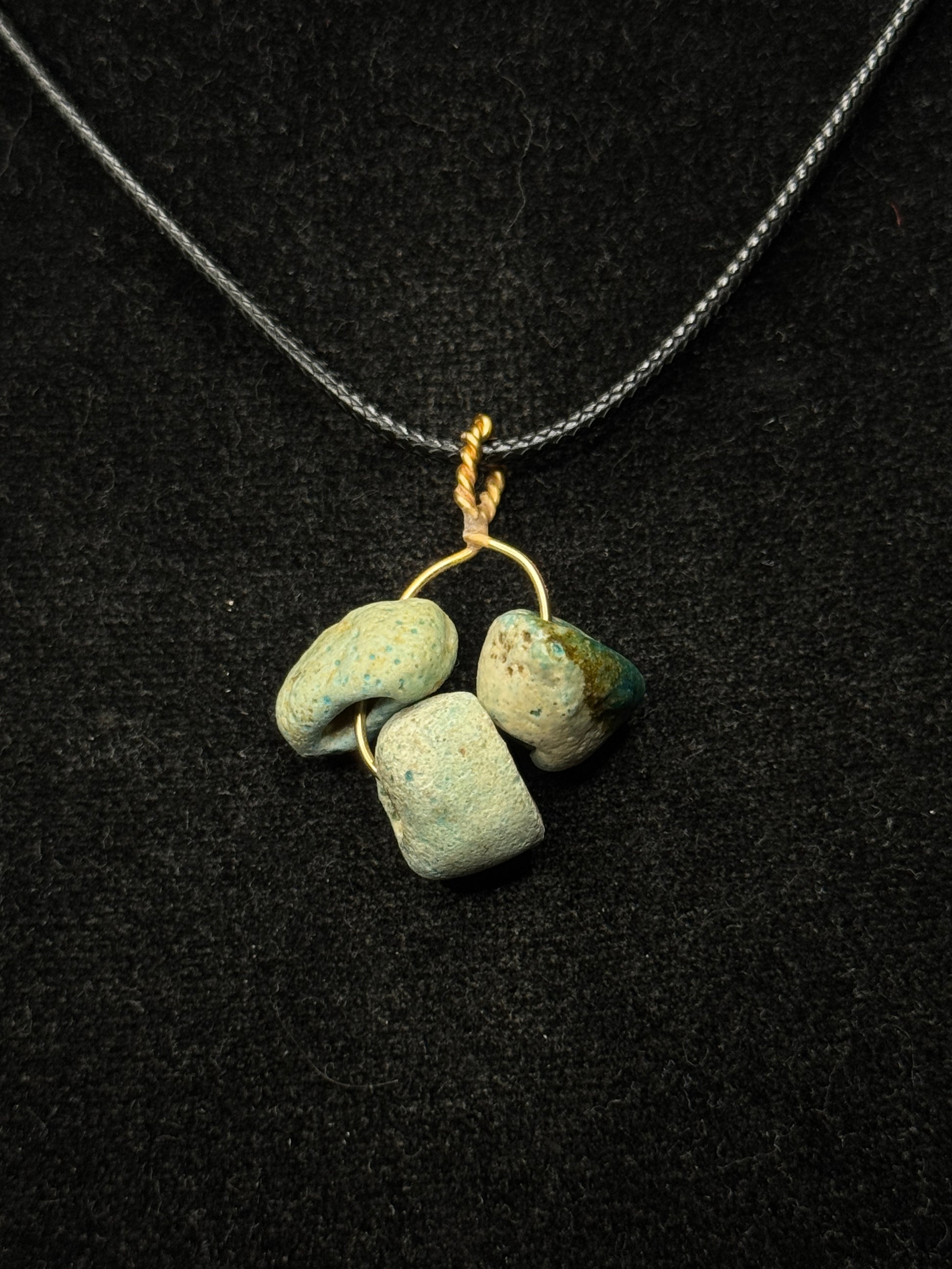 The beads, each meticulously handcrafted over 2,000 years ago, are strung together to create a beautiful piece that harmonizes antiquity with modern design. The beads exhibit the characteristic turquoise and earthy tones, representing life, rebirth, and protection, themes often associated with faience in Egyptian culture.