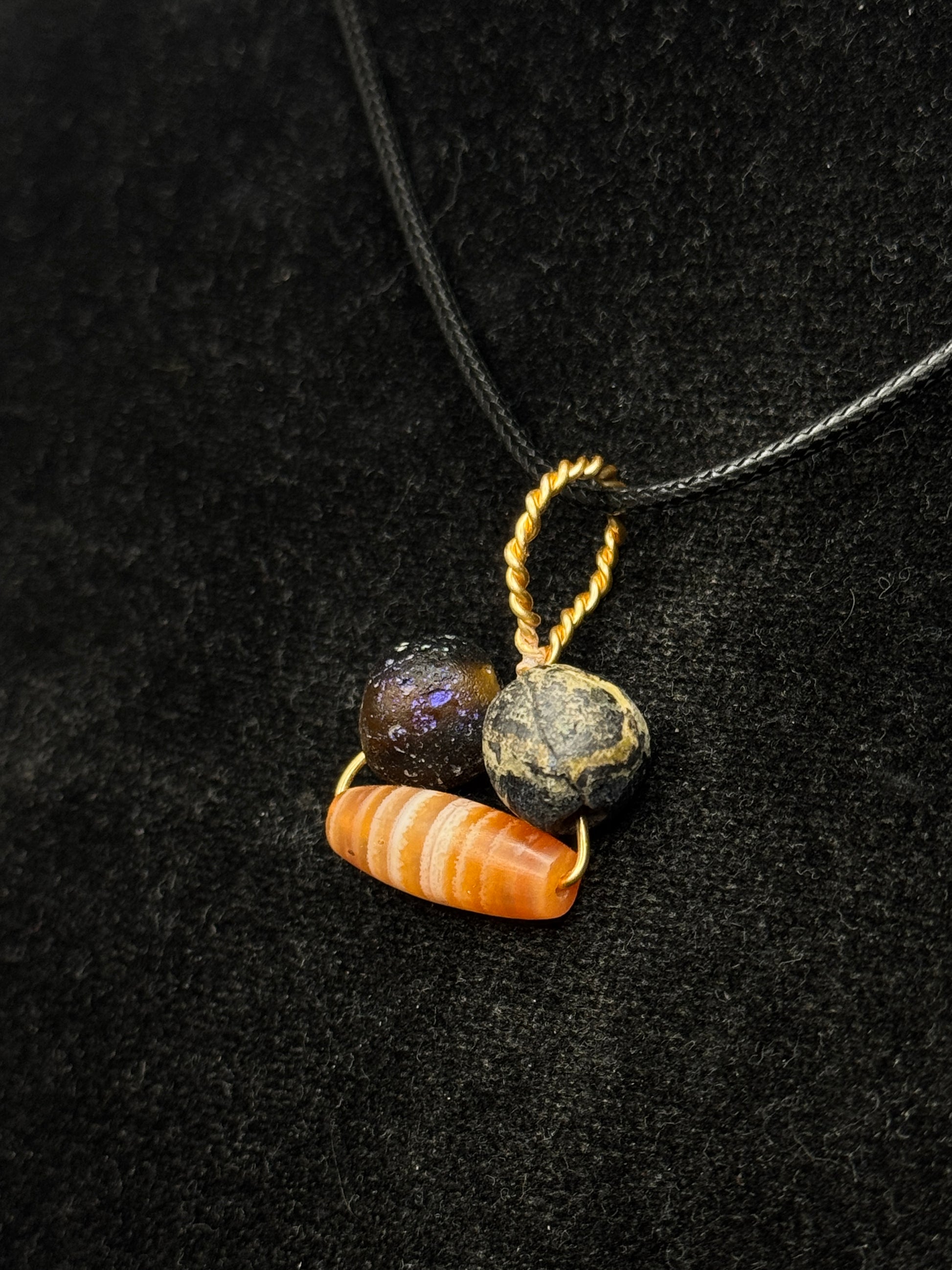 A charming ancient Roman pendant assemblage, featuring two original Roman glass beads paired with a beautifully banded agate bead, all dating to ca. 1st–3rd century AD. The beads have been mounted on a modern twisted suspension element for safe wear and display, while preserving the authenticity and integrity of the ancient components.