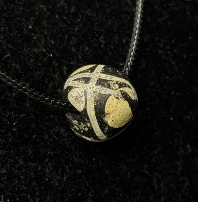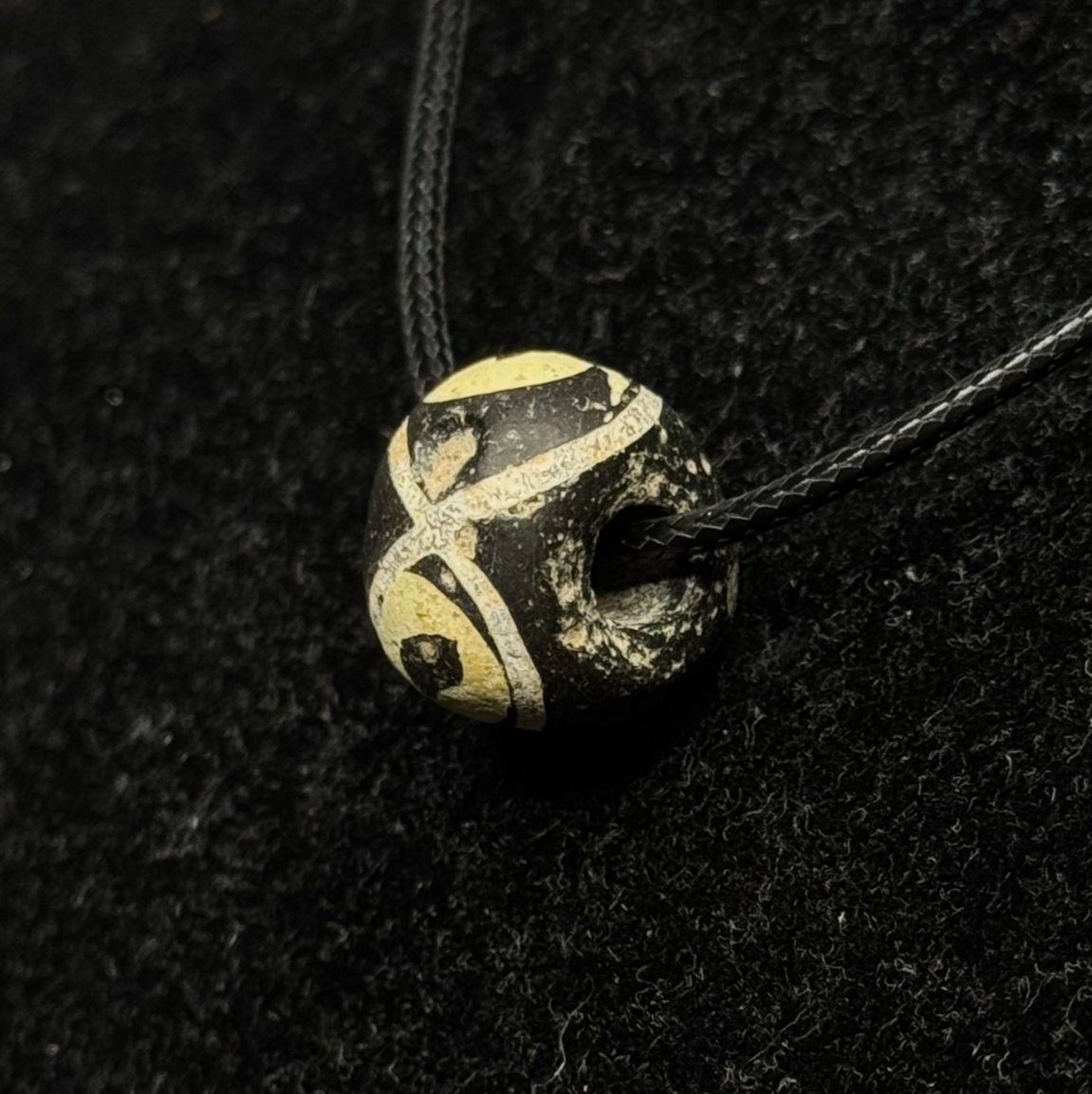 A beautiful and well-preserved ancient glass bead featuring a striking black body with yellow ‘eye’ motifs. The bead is decorated with circular eye patterns and intersecting lines, designed as a form of protection against the evil eye – a common belief in the Roman world.